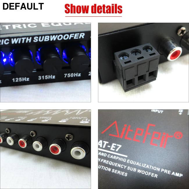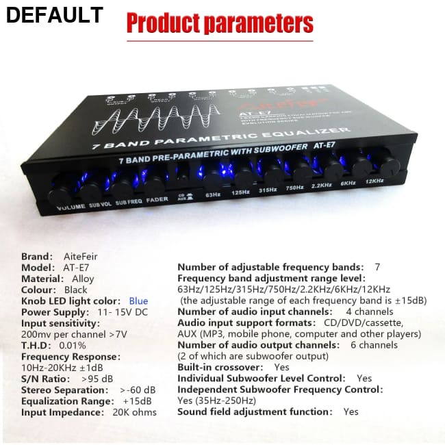 Featuring 7 adjustable frequencies 63Hz/125Hz/315Hz/750Hz/2.2KHz/6KHz/12KHz, Built in crossover, Subwoofer level controls and subwoofer frequency cutoff controls (35-250 Hz), Blue LED lights on each rotary knob. Front, rear, and sub preamp outputs, Aux input with gain knob to adjust aux volume