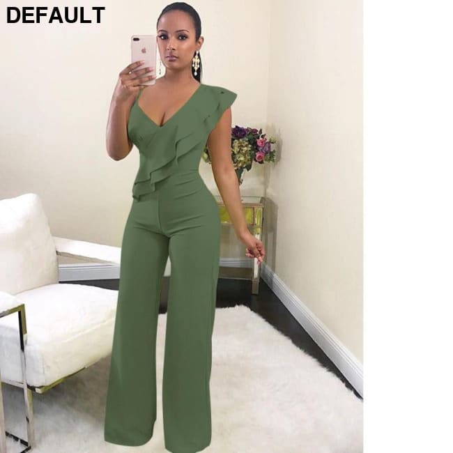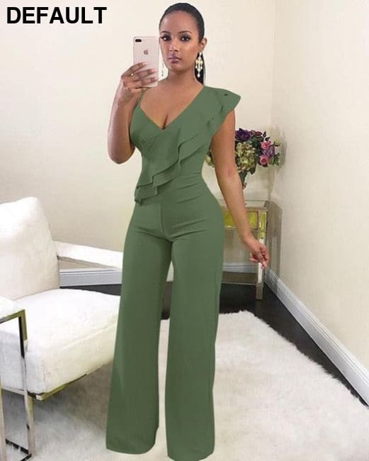 One Shoulder Ruffles Jumpsuits For Women Fashion V Neck Long Wide Leg Pants army green / S & Rompers Best Selling