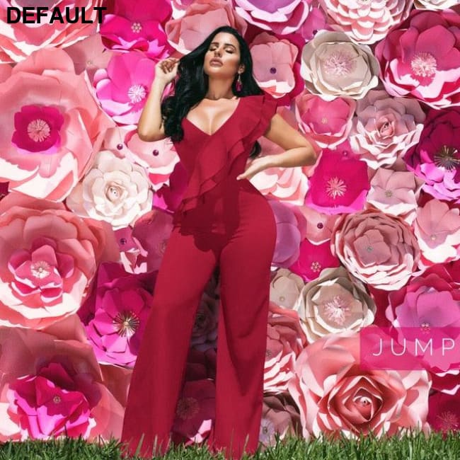 One Shoulder Ruffles Jumpsuits For Women Fashion V Neck Long Wide Leg Pants wine red / S & Rompers Best Selling Products