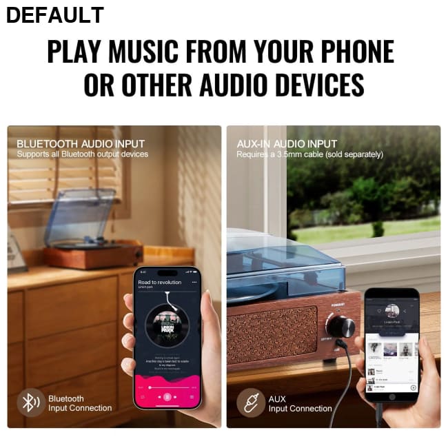 Our record player supports 33, 45, and 78 RPM, compatible with 7''/ 10''/12'' (18/25/30 cm) vinyl records. The built-in 5W dual speakers and easy Bluetooth and Aux connections let you easily stream music from your phone, tablet, or other audio devices. Explore the magic of vinyl music with us!