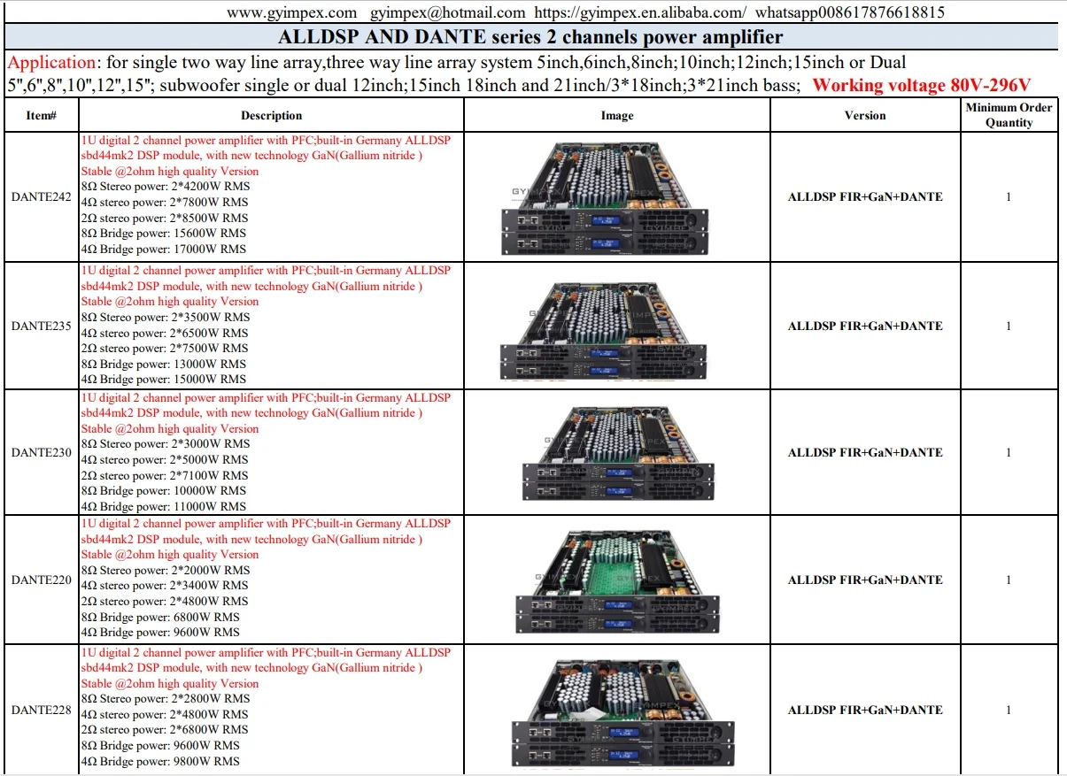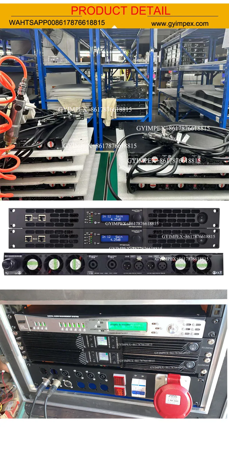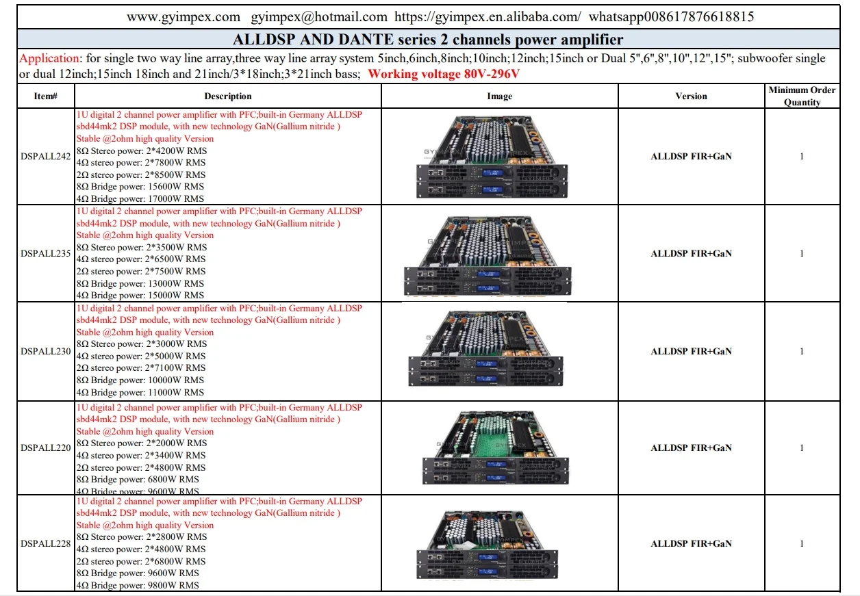 ALLDSP Series 2 channels DSP power amplifier; Application: for single two way line array,three way line array system 5inch,6inch,8inch;10inch;12inch;15inch or Dual 5'',6'',8'',10'',12'',15''; subwoofer single or dual 12inch;15inch 18inch and 21inch/3*18inch;3*21inch bass; Working voltage 80V-296V, (Dante also available); We can also produce for buyer with Original Neutrik plug, for Neutrik plug;welcome all kinds of customization from buyer. |