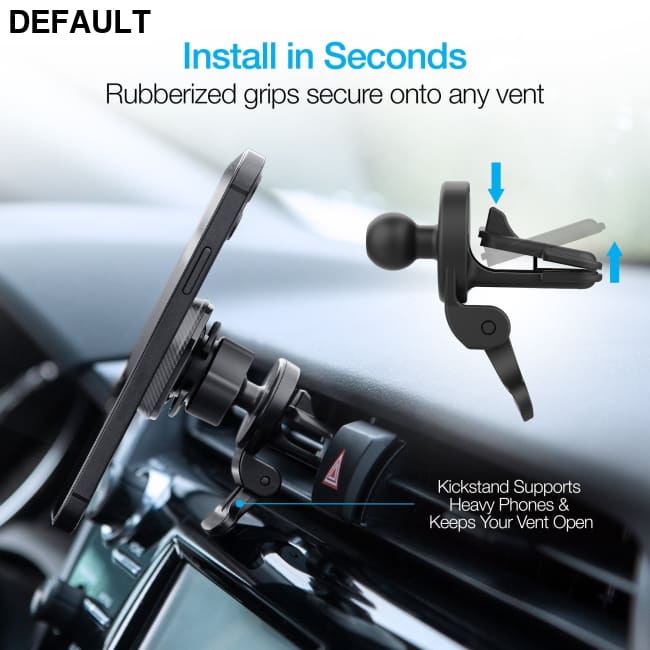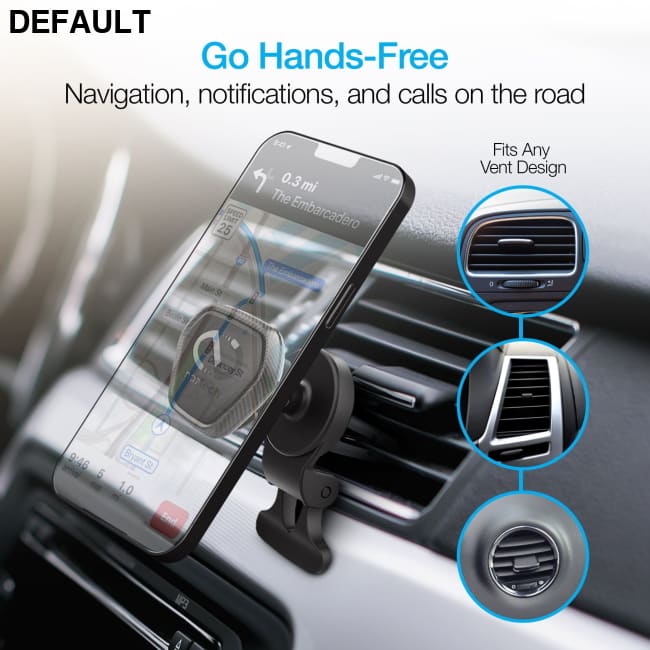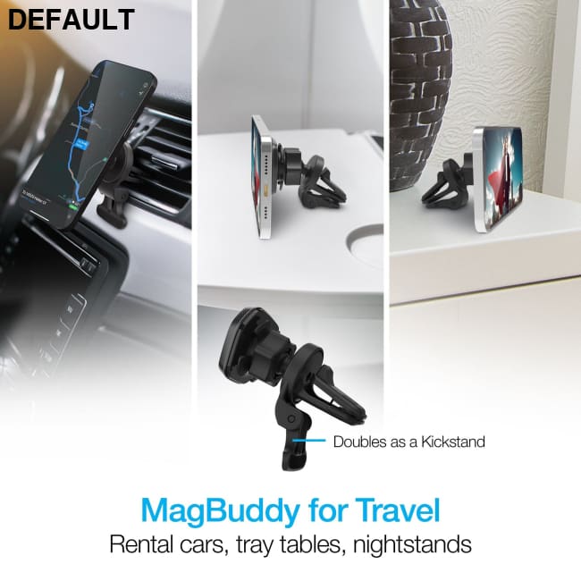 This highly versatile magnetic mounting system provides a clear unobstructed driving view while securing your mobile device at eye level and within easy reach. Enjoy a hassle-free, quick installation on your vent by gripping onto any grille with the universal rubber grips. Easily find the perfect viewing position and get maximum support for your devices using the built-in stability kickstand. Then, hover your device near the magnetic head, and four rare-earth magnets instantly grasp on, holding it in place. Keep navigation, hands-free calling, music control, and notifications at your fingertips or glanceable, even on the bumpiest roads. Unlike clunky mounts with clips and brackets that need constant two-handed adjustments, this mount is engineered for quick one-handed positioning and grab & go convenience. MagBuddy® makes life easier!