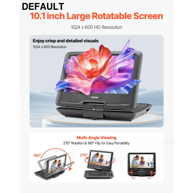 VEVOR tragbarer DVD-Player mit drehbarem HD-Bildschirm (256 mm), eingebauter Akku mit 4 Std. Laufzeit, 2 Lautsprecher, unterstützt Synchronisierung von TV/USB/SD-Karte/CD/DVD, Autoladegerät schwarz