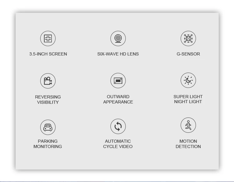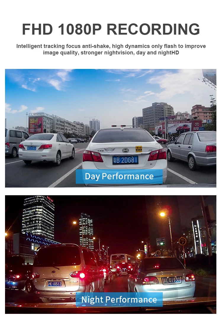WDR wide dynamic recording 、HDR high dynamic recording 、G-sensor、Parking monitoring、Motion Detection 、Loop recording、Replay