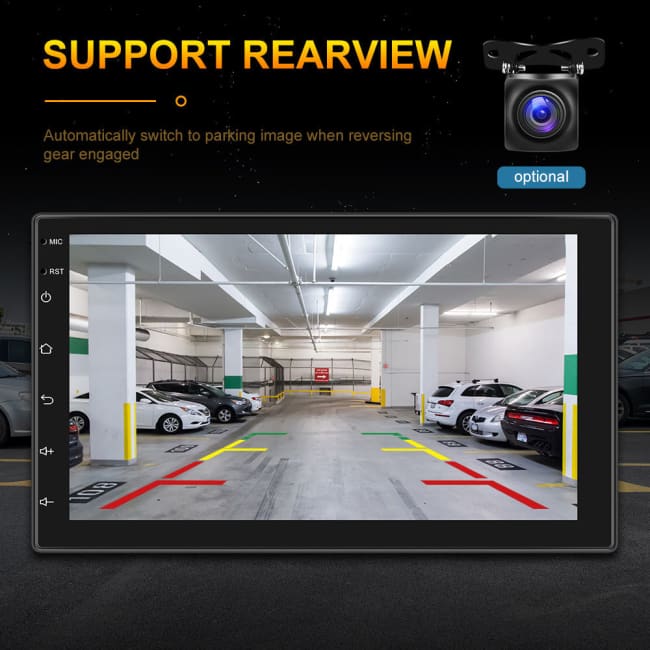Rear view camera input function(optional):Need to choose the camera, if connect to a car backup camera, the car stereo monitor will turn to rear view reversing details automatically(require optional)