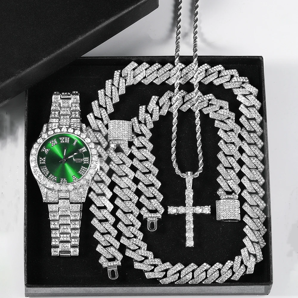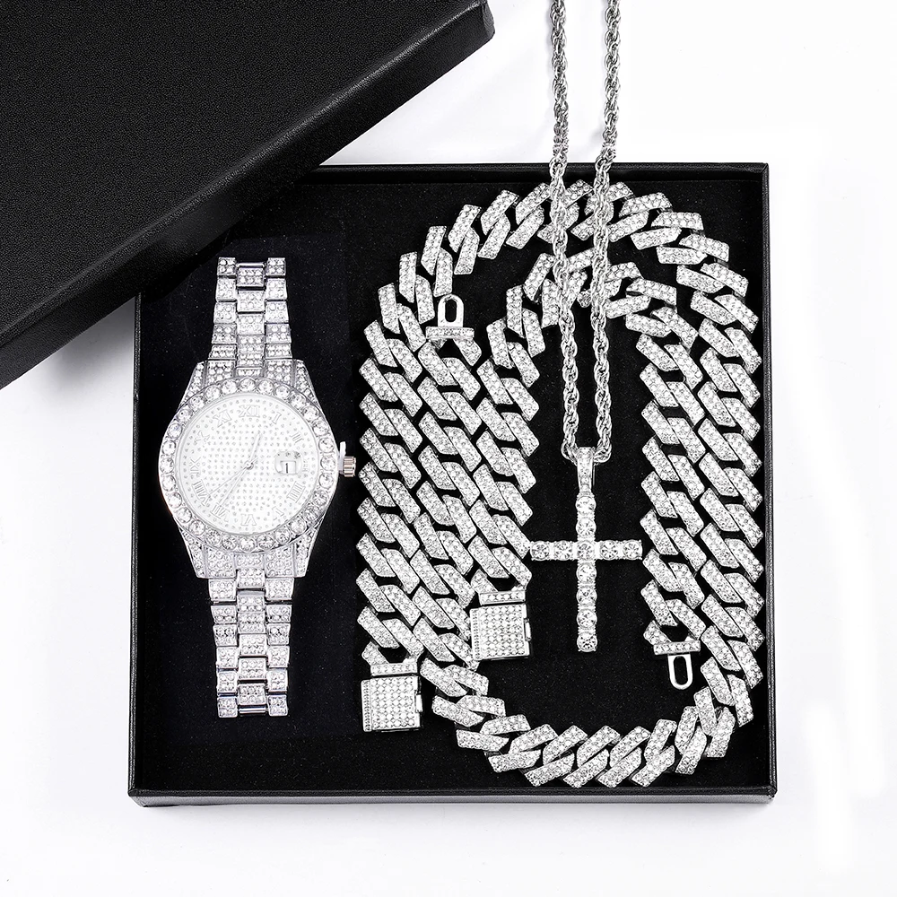 Exquisite Watch Set with Gift Box Cuban Chain Diamond Rhinestone Bracelet Pendant Cross Hip Hop Fashion Jewelry Men