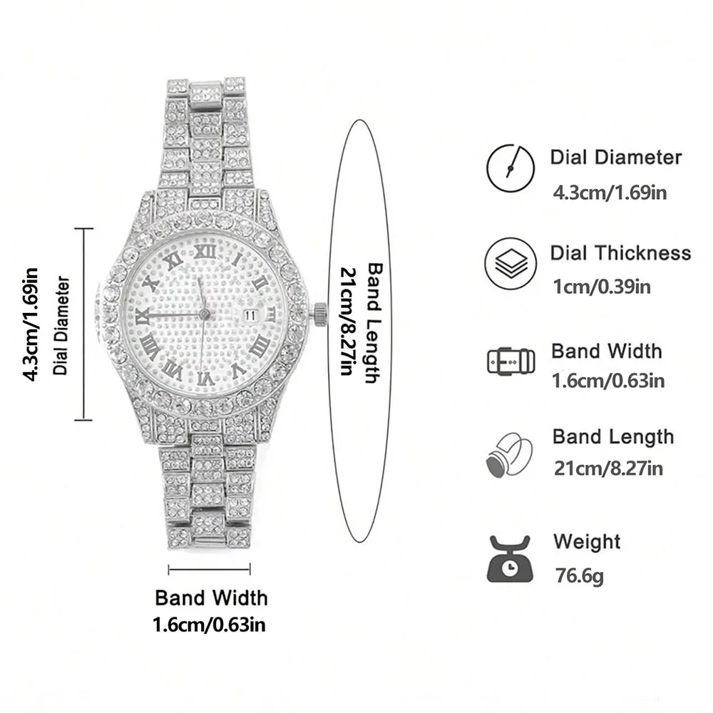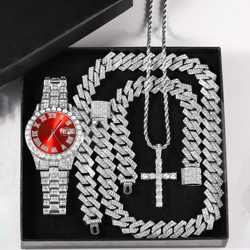 Exquisite Watch Set with Gift Box Cuban Chain Diamond Rhinestone Bracelet Pendant Cross Hip Hop Fashion Jewelry Men Women Party